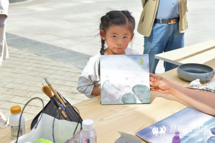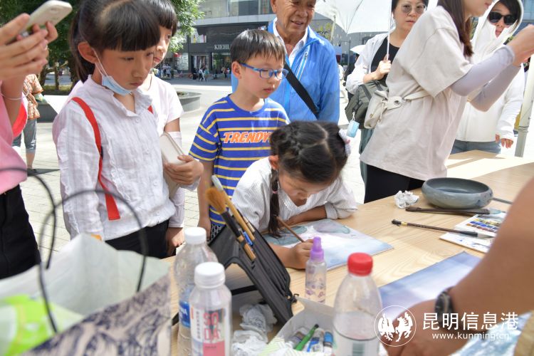 在活动现场,孙海平的工作场景只是昆明美术家协会在本次惠民活动中的一个缩影,来到现场的群众中,青少年占了绝大多数,看到笔尖勾勒下的水彩画与国画,激起了他们动手的欲望。在艺术家们的耐心指导下,小朋友们开始了创作,在学习中感受到了笔墨下作画的魅力。现场人气持续高涨,艺术家们早已忘却了额头上的汗水,艳阳与高温仿佛已被忽略。
