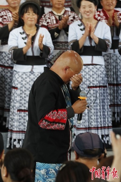 在小水井苗族农民合唱团成立20周年专场演唱会上,当演员和观众在歌声中相互挥手告别时,团长张晓明(中)不禁潸然泪下,哽咽难言。中青报·中青网记者 张文凌/摄