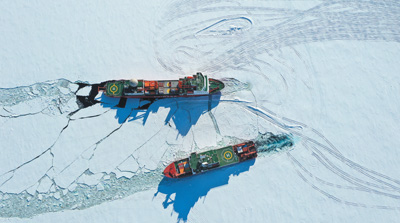 “这次陆缘冰接近2米的厚度,远远超出了‘雪龙’号破冰能力,也超过了‘雪龙2’号设计的1.5米破冰水平。”“雪龙2”号船长肖志民告诉记者,面对挑战,科考队精心准备,利用直升机和无人机开展多次探冰勘察,制定破冰方案。通过艏艉向连续破冰、艏向冲撞破冰的方式,“雪龙2”号仅用2天时间,就开辟出长度约16.5海里的陆缘冰区航道,最终抵达预定卸货点,并将“雪龙”号引航至卸货点。