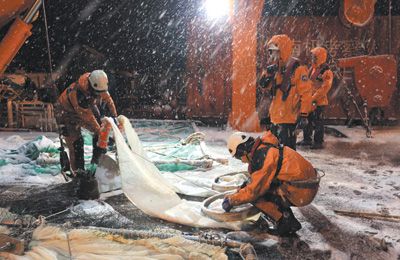 科考队员们在“雪龙2”号的艉甲板进行海洋调查准备工作。陈亮宇摄