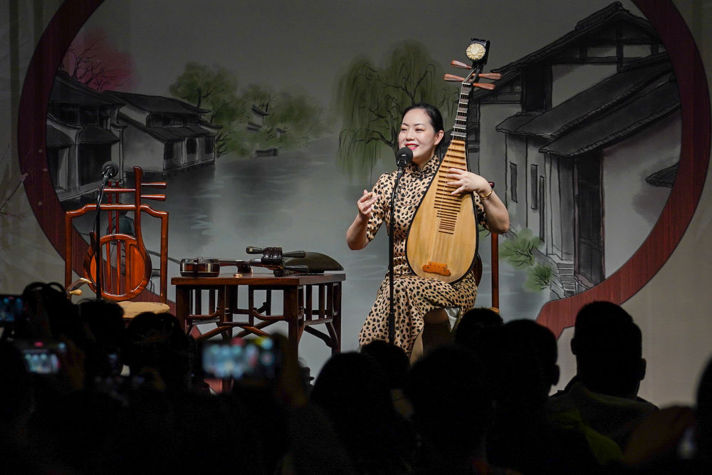 评弹演员吴亮莹在苏州市姑苏区一处评弹茶馆演唱苏州评弹版《声声慢》(2023年4月5日摄)。新华社记者 李博 摄