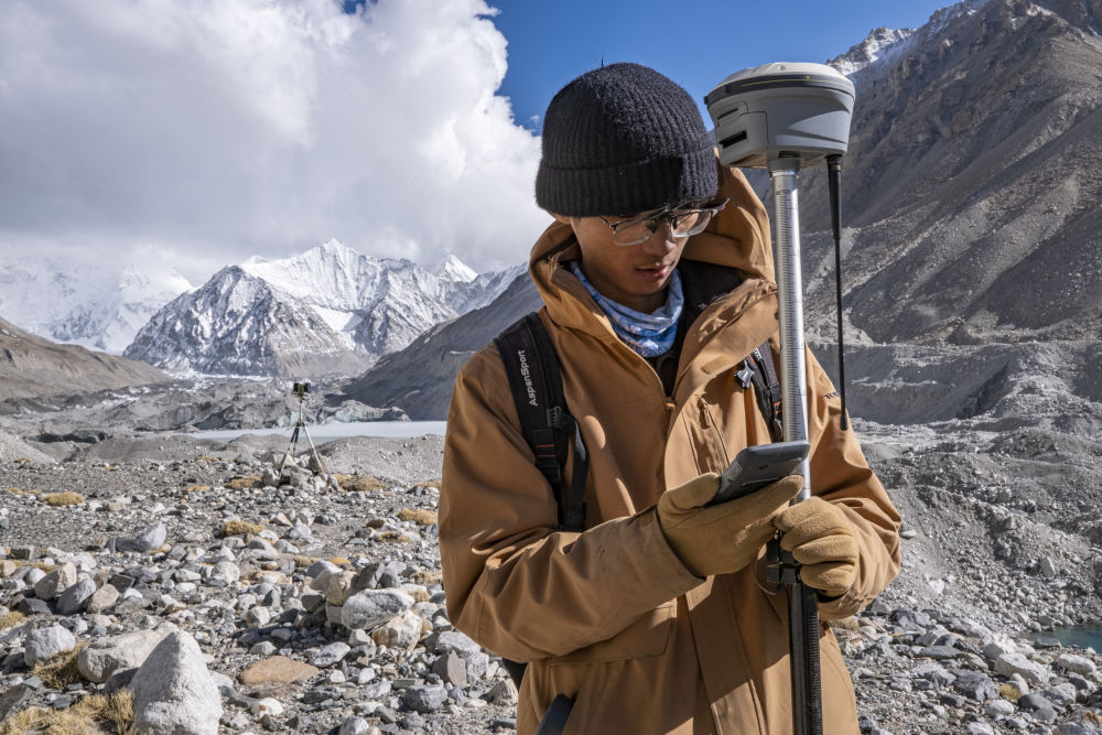在珠峰海拔约5300米处,来自中国科学院西北生态环境资源研究院的科考队员薛雨昂在对冰川进行实时差分GPS定位(5月15日摄)。新华社记者孙非 摄