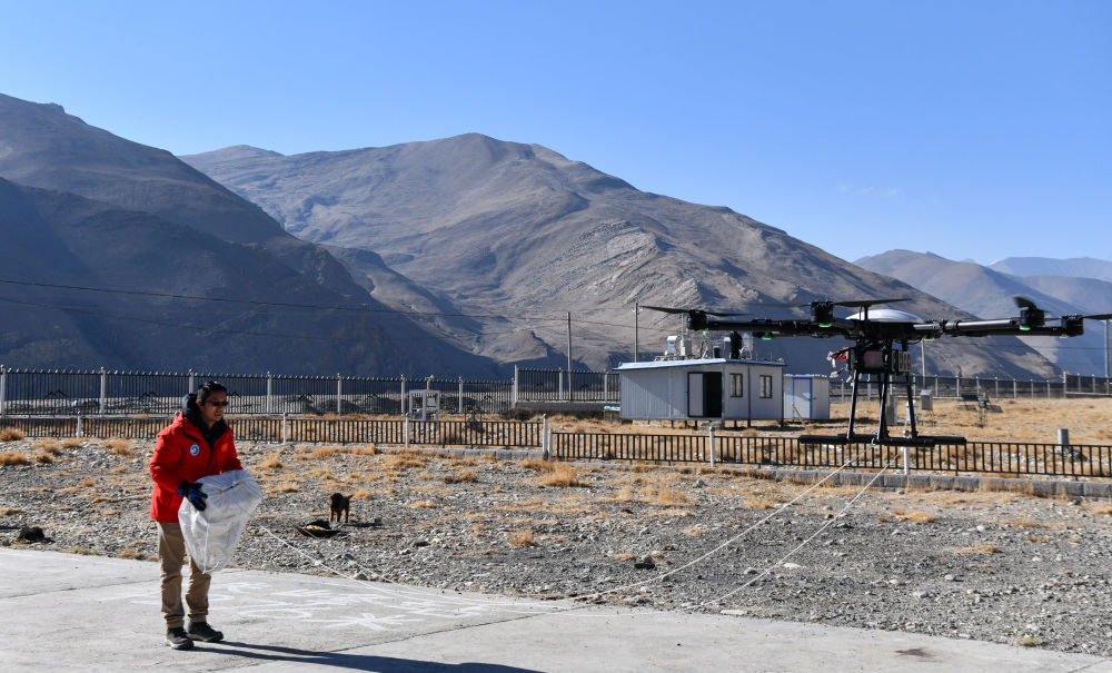 在中国科学院珠穆朗玛大气与环境综合观测研究站,中科院青藏高原研究所副研究员汪宜龙放飞无人机采集空气样本(5月10日摄)。新华社记者晋美多吉 摄