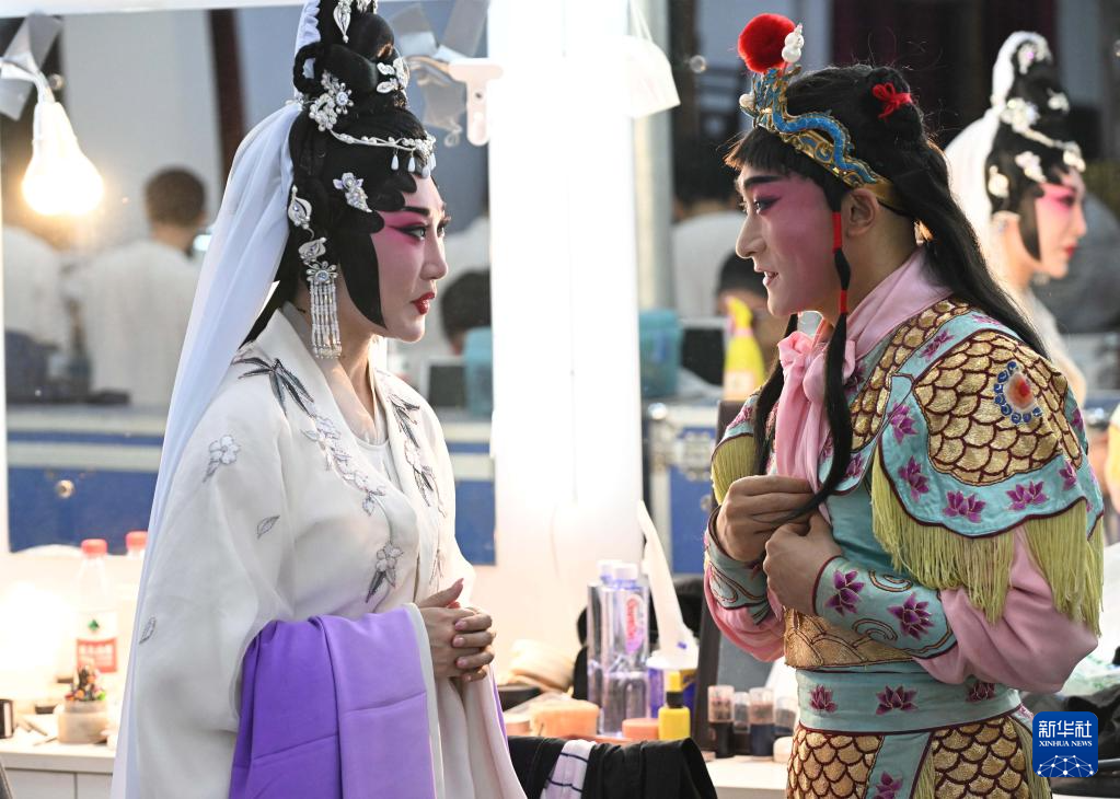 5月29日,刚获得第31届中国戏剧梅花奖的广州粤剧院演员李嘉宜(左)与河北省河北梆子剧院演员郝士超(右)在后台交流。新华社发(闫志国 摄)