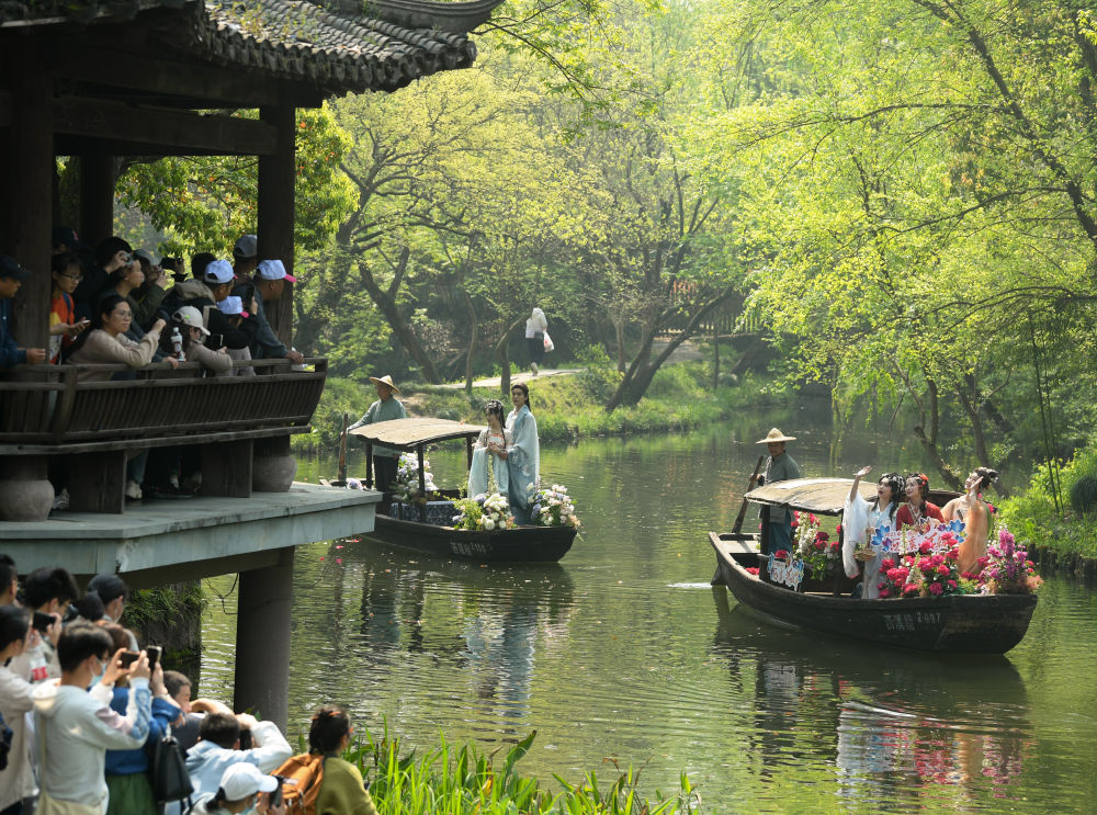 游客在杭州西溪湿地观看宋韵花朝节游船巡游(2023年4月2日摄)。新华社记者 翁忻旸 摄