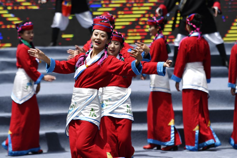 5月28日,演员在米林市第十五届黄牡丹藏医药文化旅游节开幕式上表演节目。新华社记者 张汝锋 摄