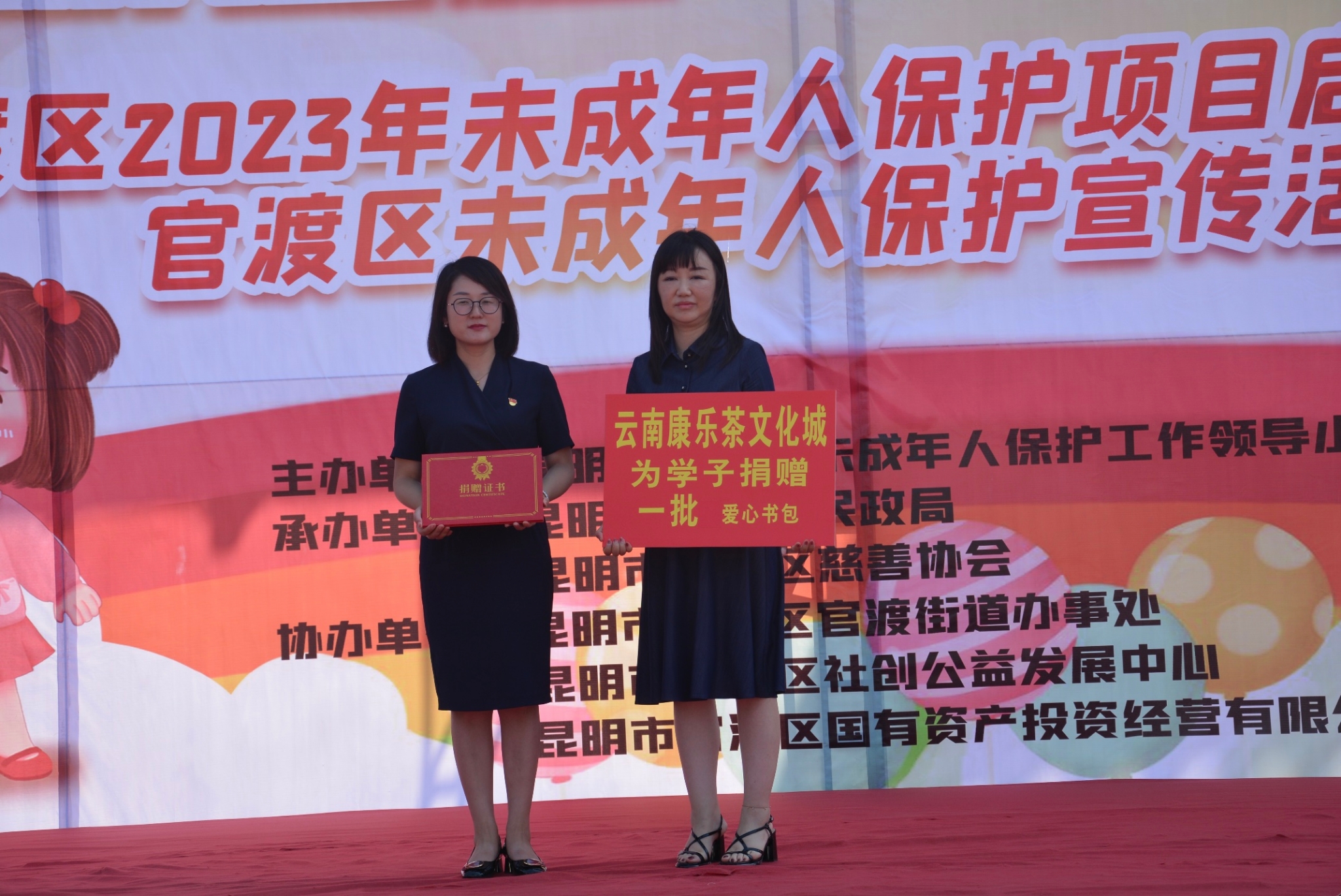 活动现场,爱心企业代表昆明懿德酒业有限公司、云南康乐茶文化城现场为官渡区困境儿童捐赠爱心物资,区民政局局长王芳为爱心单位颁发荣誉证书。云南净皖进出口有限公司及爱心人士一同捐赠爱心物资,本次活动所筹爱心物资将由区民政局分发到辖区内困境儿童手中。