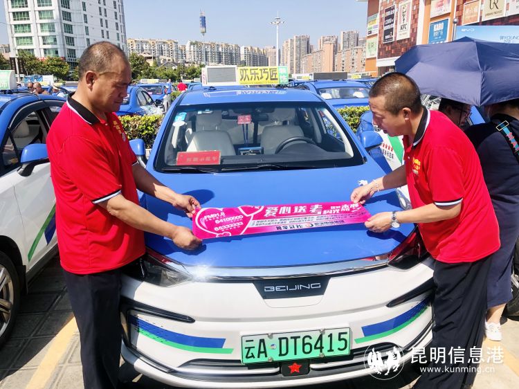 昆明信息港讯 记者上官艳君 5月30日,以“筑梦未来•闪光青春”为主题的第二十届“爱心送考”活动发车仪式在昆明世纪金源购物中心广场举行,为报名参加“爱心送考”的巡游出租汽车驾驶员车辆贴标。
