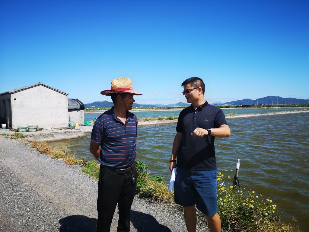 何琳(右)在宁海县为养殖户开展技术指导。(何京 摄)