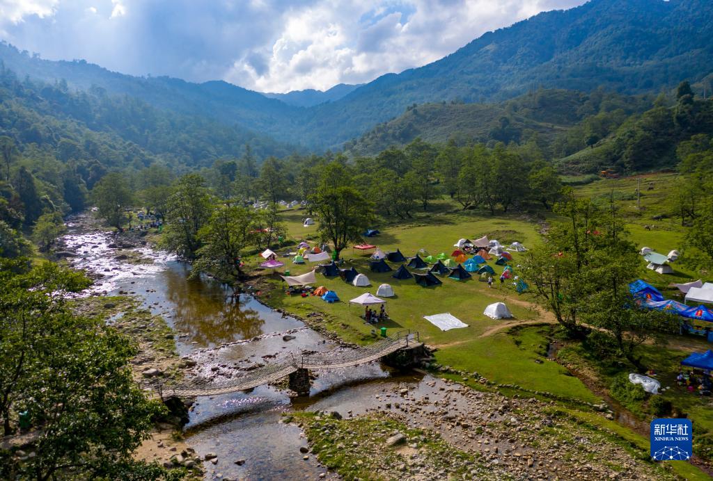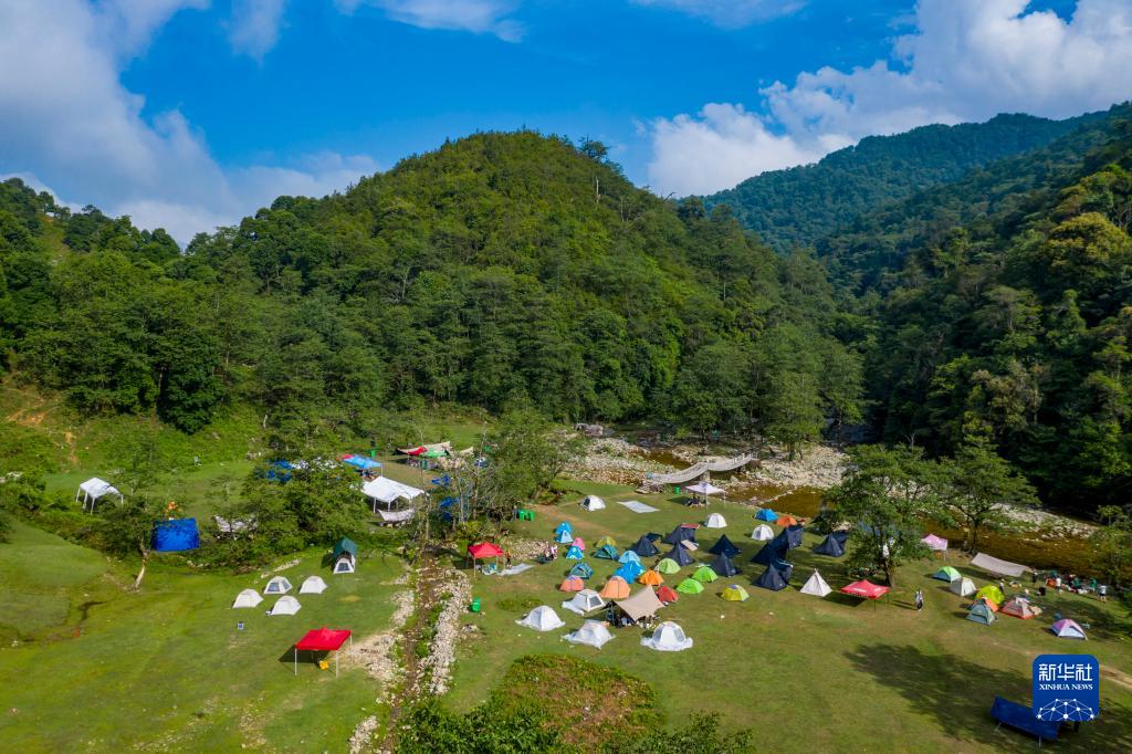 5月29日,游客在坪河草地景区露营(无人机照片)。新华社记者 陈欣波/摄