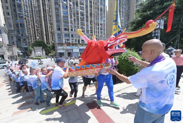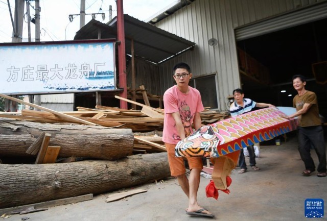 5月31日,在福州市闽侯县南通镇方庄村方忠雄龙舟厂,员工将新龙舟运出。