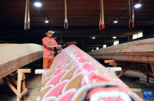 5月31日,福州市闽侯县南通镇方庄村方忠雄龙舟厂的方剑伟擦拭新龙舟进行。