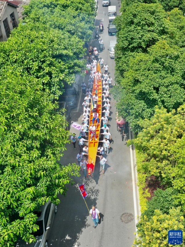 5月31日,福州市连江县龙舟爱好者在运送新龙舟(无人机照片)。
