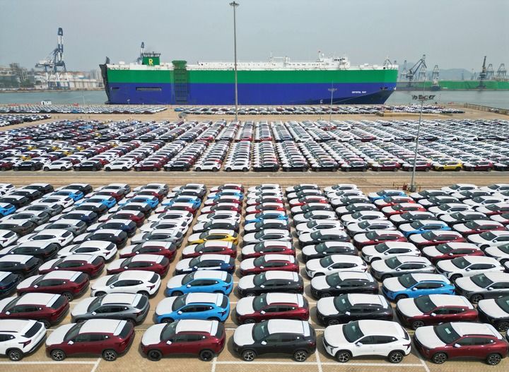 5月9日,在山东港口烟台港,大批出口商品车集结到港准备通过汽车滚装船发运(无人机照片)。新华社发(唐克 摄)