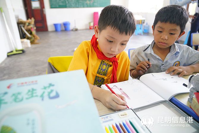 孩子们兴奋地拿起填色本,挑选画笔,开始了梦想家园的描绘。五彩缤纷的画笔勾勒出山间油画般的田野、整齐的房屋......“我未来的家乡有高楼大厦”“我要画很多汽车,妈妈开车载我去学校。”不一会儿,一个个充满着童真的作品完成了,孩子们举着画纸争先恐后地挤在“燕子姐姐”身边,不断地诉说梦想的家乡。“我画了一个化学仪器,长大我想成为科学家”“我想成为飞行员,想开着飞机看看这里。”“我喜欢蓝色,想看大海,姐姐你看,我在山边画了大海”一年级傣族小女孩拉着赵婧羽说。“梦想就像曲折的山路,很远也很曲折,只要坚持,就一定能实现。”刘赵安几告诉孩子们,实现梦想可不是一朝一夕轻松的事,要刻苦学习文化知识,坚持强身健体,长大后才能追逐属于自己的梦想。