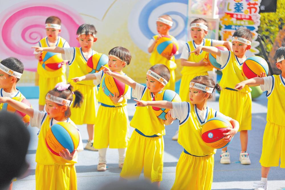 昆明市西山区香榭丽园幼儿园的小朋友表演篮球操。 本报记者 陈飞 摄