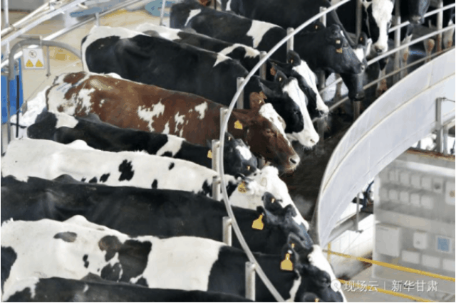 伴随着“哞哞”声,一头头奶牛正“排队”走上转盘式挤奶机,武威金宇浩睿农牧业有限公司的工作人员辅助自动化设备完成挤奶,一片繁忙有序的景象。牧场建有一座容积9万立方米的黑膜沼气池,整个牛场运行实现了饲草种植—奶牛养殖—沼气发电—粪肥有效循环利用的绿色循环体系,犹如 “绿色奶牛工厂”。负责人金建荣说:“牧场粪污经过各项分离系统后,污水可用于沼气发电,预计全年可发电一千万度以上,能自供牧场70%用电量,粪便可转化为高质量有机肥,用于土地的改良。”