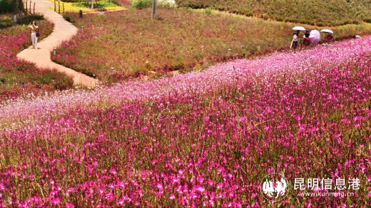 昆明信息港讯 记者杨雁 如今,位于云南省安宁市连然街道办事处宁湖水库南侧的宁湖田园成为新晋的网红打卡地,每天约有千人来到宁湖田园大坝,与坝坡上一片艳丽的山桃草美丽邂逅。
