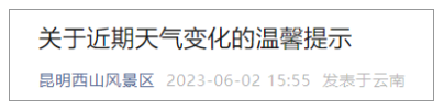 昆明现将进入雨季,未来或将有强对流天气,天气变化莫测,容易造成道路湿滑,事故多发。西山景区在此提示前往西山凌虚阁观日出的游客,雨季非观赏日出的适宜季节,建议合理安排行程,尽量避开在恶劣天气出游;出游提前了解安全知识,注意出游天气情况,确保人身安全。