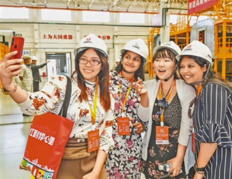 外媒记者在“复兴号”诞生地中车青岛四方机车车辆股份有限公司生产车间自拍留念。