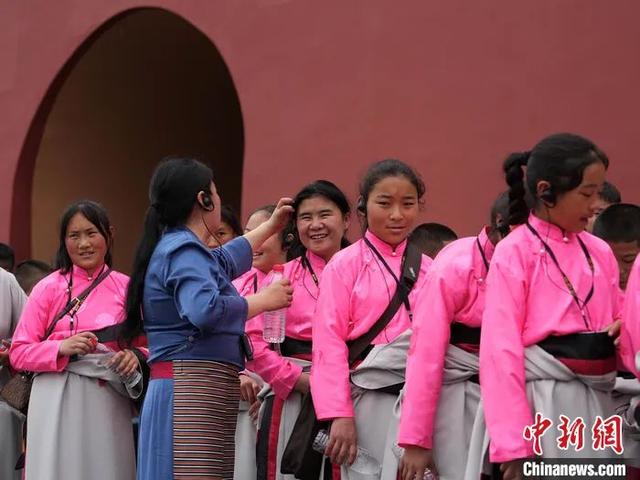 老师白玛拉毛在给索南拉吉(中)整理头发。中新社记者 崔楠摄