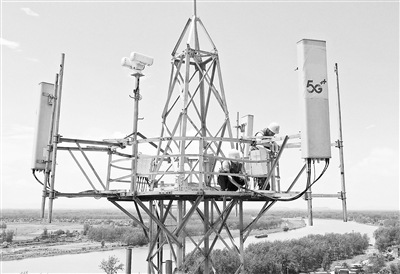 在5G基站,工作人员正在调测天线。本版图片由视觉中国提供