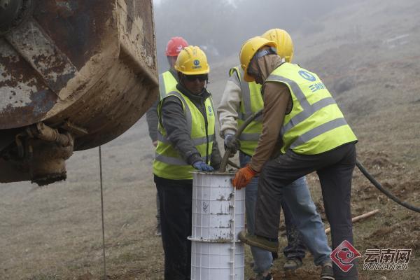在药山镇小坪子光伏项目施工现场,工人们正有条不紊地进行基柱浇筑,大家齐心协力将钢筋和灌装模具放置在打好的基孔中,浇灌车轰隆作响往基柱中加入混凝土,工人们用震动棒震动混凝土……现场一派热火朝天的施工景象。