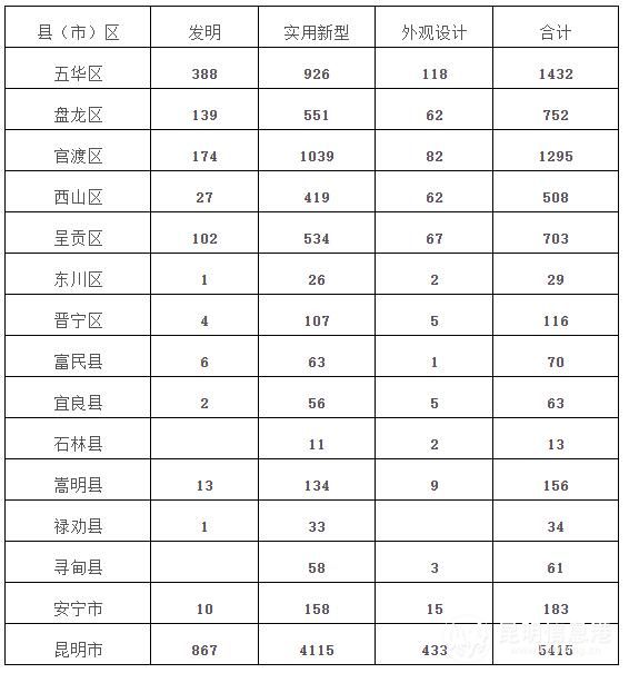 2023年一季度,昆明市专利授权5415件,同比下降18%。其中:发明专利授权867件、同比增长51%、占全市专利授权量的16%,实用新型专利授权4115件、同比下降27%、占全市专利授权量的76%,外观设计专利授权433件、同比增长6%、占全市专利授权量的8%。