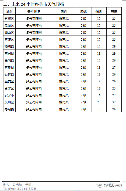曲靖市北部、昆明市北部、楚雄州北部、丽江市东部阴有中到大雨,其它地区阴天间多云有小到中雨局部大雨。