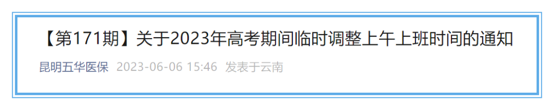为缓解高考期间考生赴考时间段交通压力,确保广大考生顺利出行,按时到达考点。根据《昆明市人民政府办公室关于2023年高考期间市县两级机关事业单位临时调整上午上班时间的通知》要求,2023年高考期间,市、县两级机关事业单位(除学校外)实行错峰出行。五华区医疗保障局6月7日(星期三)、6月8日(星期四)上午上班时间临时调整为10:00,6月9日(星期五)恢复原作息时间。