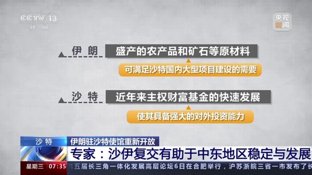 沙特政治学者 穆罕默德·纳菲阿:相信在中国斡旋之下达成和解的沙伊两国能形成稳定的合作的机制或框架。双方在经贸和投资等领域合作前景广阔,而地区内各国也将可以从中受益。