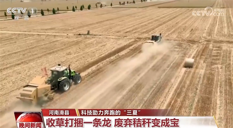 在河南滑县上官镇的麦田里,多种农机正在联合作业。在收割机后面紧跟着的是搂草机和秸秆打捆机,搂草机将散落的秸秆搂成行,打捆机紧跟着吸附秸秆、收草打捆。运输车辆将码好的秸秆拉往养殖场、发电厂进行综合利用。