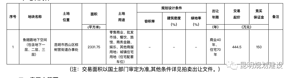 昆明信息港讯(昆明日报 记者李梦瑶)日前,昆明市自然资源和规划局发布《鱼翅路地下空间(包含地下一层、二层、三层)》土地拍卖出让公告。