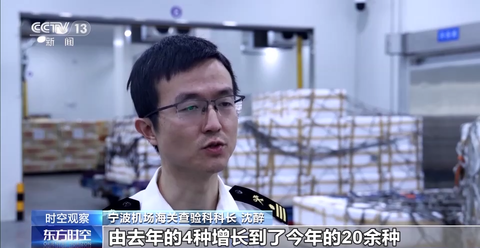 宁波机场海关查验科科长 沈醉:我们这边进口的生鲜种类由去年的4种增长到了今年的20余种,主要包括龙虾、榴莲、山竹、青蟹、黄鳝等,随着今年5月份宁波到比利时列日航线的开通,等到冰岛禁渔期结束以后,预计也将会有北欧的三文鱼等冰鲜搭载着这个航班来到宁波。