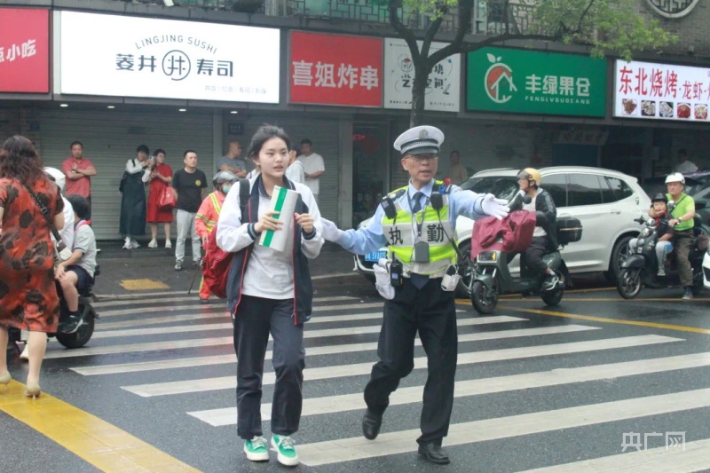 在杭州第九中学考点门口,交警为考生服务(央广网发 杭州市委宣传部供图)