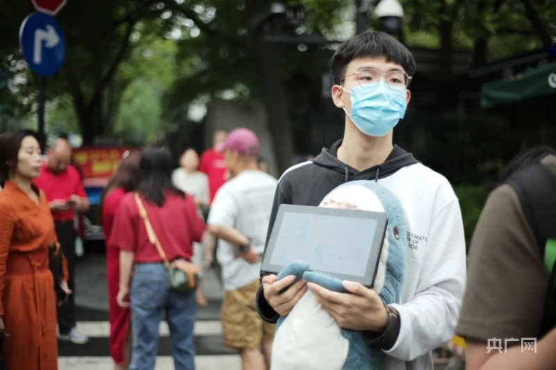 在杭州学军中学考点,高二学生带着鲨鱼玩偶到校门口送师哥师姐高考,祝他们“鳍开得胜,大鲨四方”(央广网发 杭州市委宣传部供图)