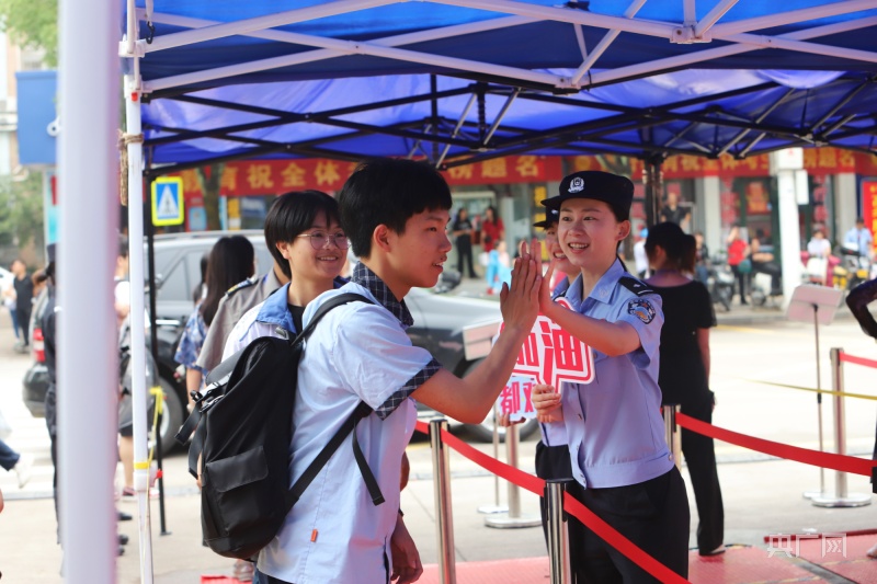 在台州市路桥中学考点门口,民警与考生击掌,为他们加油打气(央广网发 蒋友亲 摄)