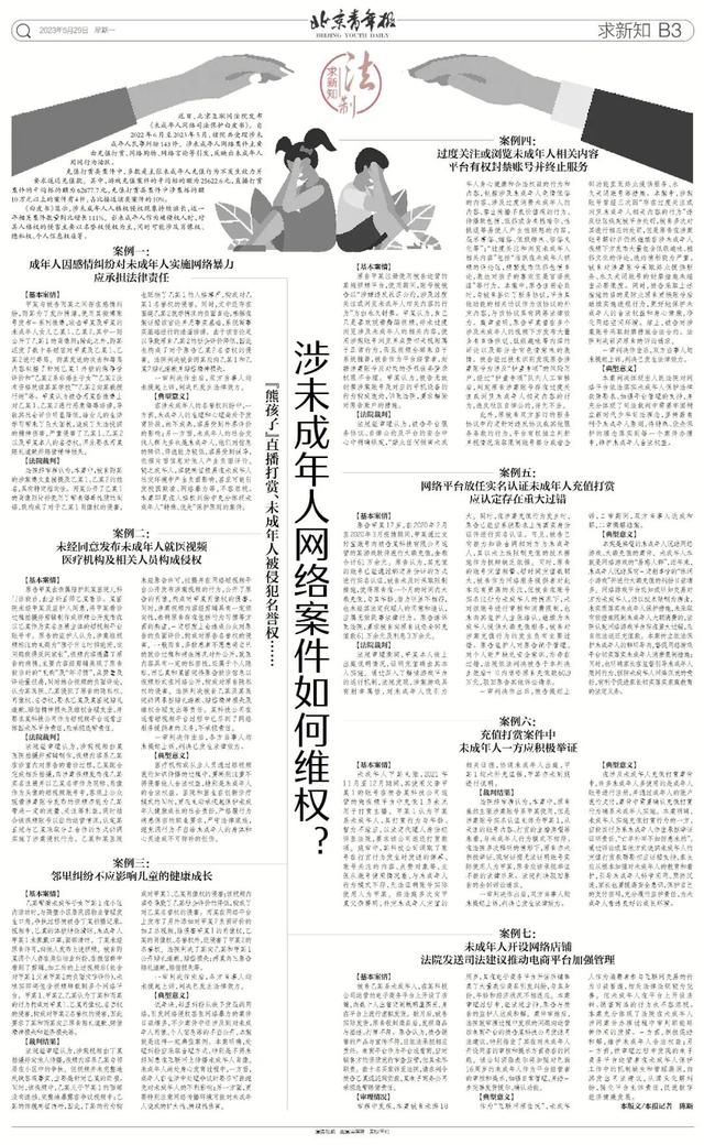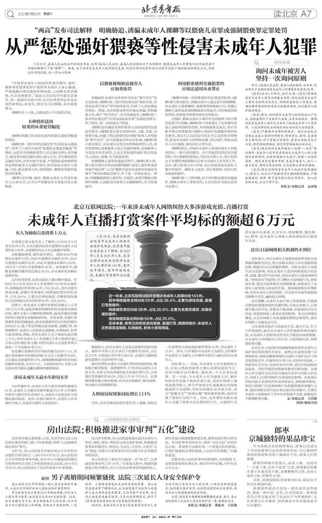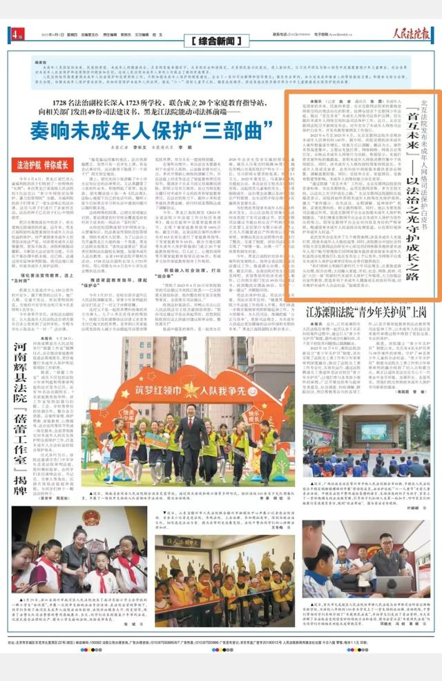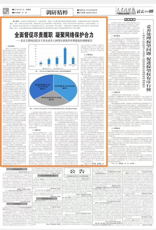 未成年人网络司法保护相关举措引发社会关注,李文超、崔璐、王红霞3位法官连续做客中央广播电视总台《中国之声》《新闻直播间》《法治在线》栏目,6月1日《人民法院报》理论周刊版头条,《北京晚报》《北京青年报》整版报道,《法治日报》《北京日报》《北京青年报》《中国消费者报》等30多家媒体关注。