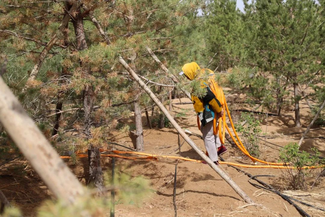 △2023年5月31日,治沙工人在库布其沙漠亿利生态治理区内搬运水管,准备为树木浇水。