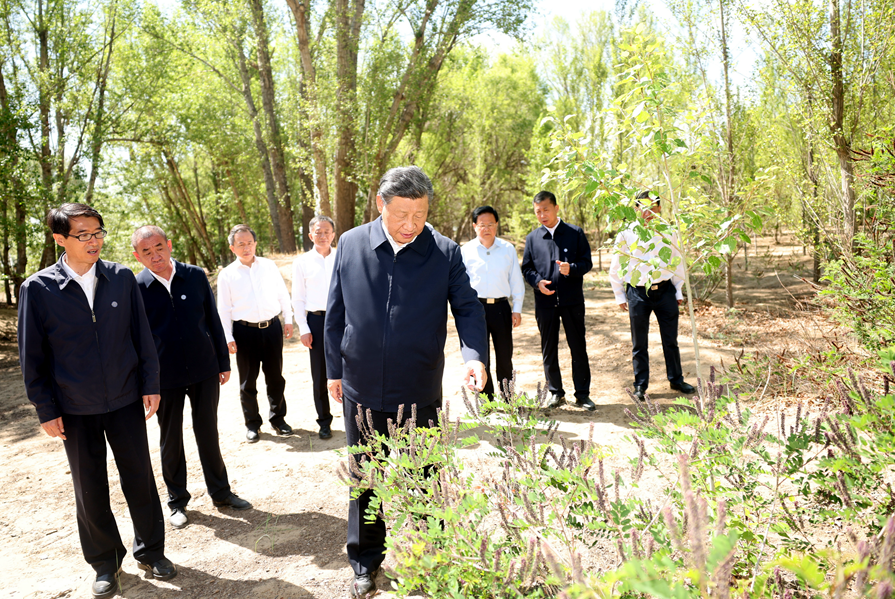 2023年6月5日至6日,中共中央总书记、国家主席、中央军委主席习近平在内蒙古巴彦淖尔考察,并主持召开加强荒漠化综合防治和推进“三北”等重点生态工程建设座谈会。这是6日上午,习近平在临河区国营新华林场考察。新华社记者 鞠鹏 摄