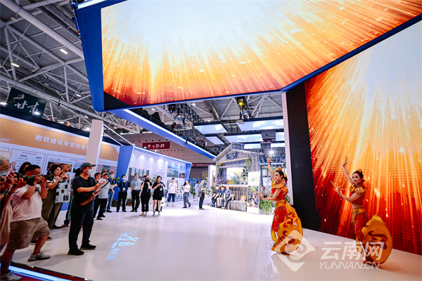 展区响起极具风情的民族曲调,西双版纳州民族文化工作团的舞蹈演员跳起了傣族的宫廷长甲舞,为现场观众带来不一样的民族视听盛宴。