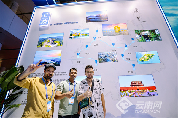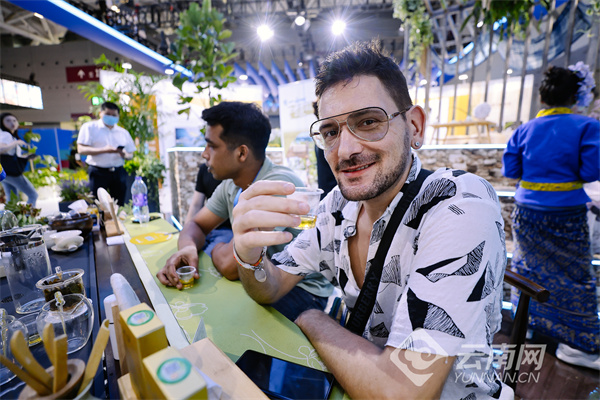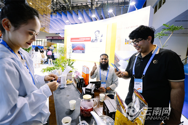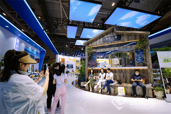 在展区入口,扫赠送礼品的展台前排满了观展游客,大家通过扫码互动领取“有一种叫云南的生活”文创礼包;展区中央,“有风小馆”成为最热门的留影点,去“有风的地方”已成为大家展区拍照留念的必备打卡事项。来自乌克兰和印度的游客跟着徐霞客游云南的足迹了解了云南的美景美色,随后坐下来品尝普洱茶。巴基斯坦的游客则对杯中散着热香的云南黑咖啡赞不绝口。