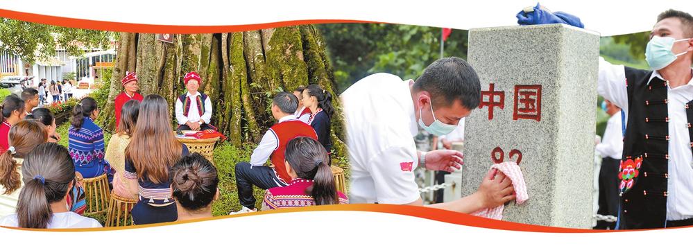 沧源县班洪乡老支书宣讲党的二十大精神。 河口县瑶山乡牛塘村党员清洗擦拭界碑。