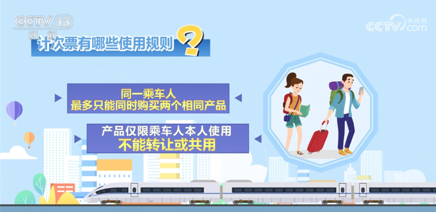 铁路12306科创中心高级技术经理 王永峰:20次计次票指的是旅客可以在90天内最多使用20次,在购买产品时指定区间、指定席别的这样一个产品。定期票指的是一个可以在30日内最多乘坐60次指定区间和席别的车次。目前,计次票是按照常规票价的九五折来进行定价,定期票有一个上限次数是30日最多乘坐60次,但是我们定价是按照44次来定价。