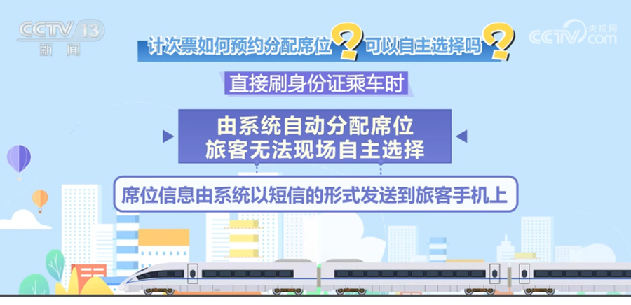 旅客提前预约时,可以根据车票销售情况,自主选择席位;直接刷身份证乘车时,由系统自动分配席位,旅客无法现场自主选择。席位信息由系统以短信的形式发送到旅客手机上。
