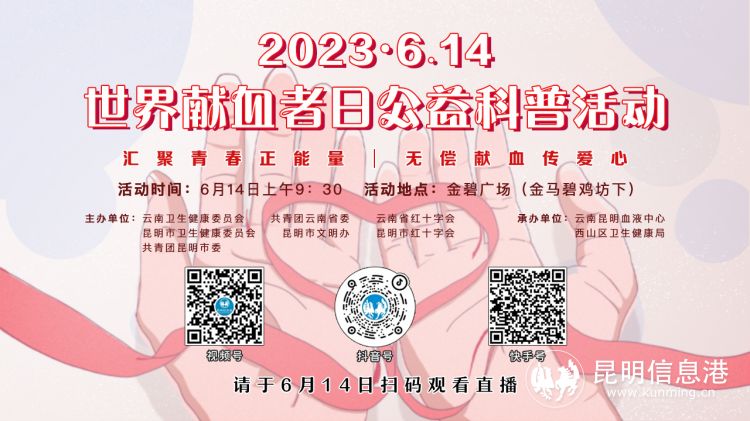 昆明信息港讯 记者李红鸾 冯垚 在2023年第20个世界献血者日来临之际,为进一步普及无偿献血科普知识,感谢回馈广大献血者,发展壮大无偿献血者队伍,6月14日,由云南卫生健康委员会、共青团云南省委、云南省红十字会、昆明市卫生健康委员会,昆明市文明办、昆明市红十字会、共青团昆明市委主办,云南昆明血液中心、西山区卫生健康局承办的“6.14”世界献血者日公益科普集中宣传活动将在金碧广场正式拉开帷幕。届时,昆明信息港抖音号、视频号、快手号三号同时直播,欢迎大家扫码观看。