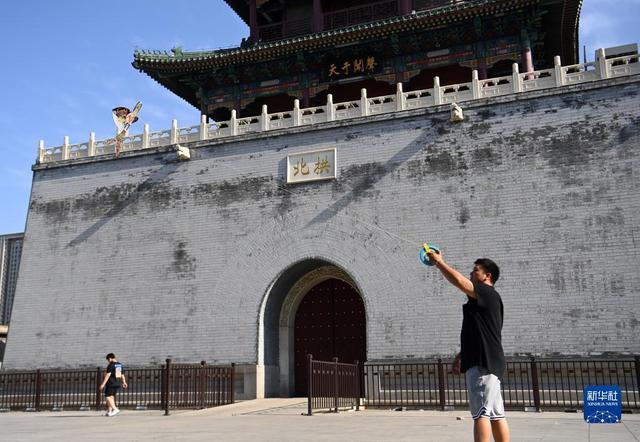 在天津市鼓楼附近,魏博文在放飞一架制作完成的风筝(6月8日摄)。