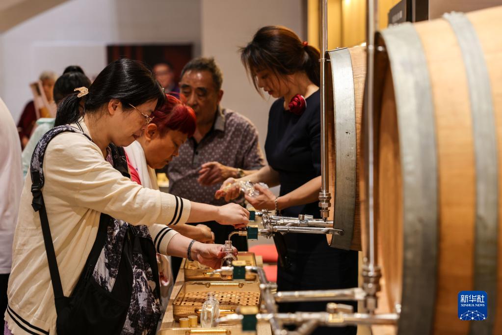 6月12日,游客在张裕酒文化博物馆内体验灌装白兰地酒。