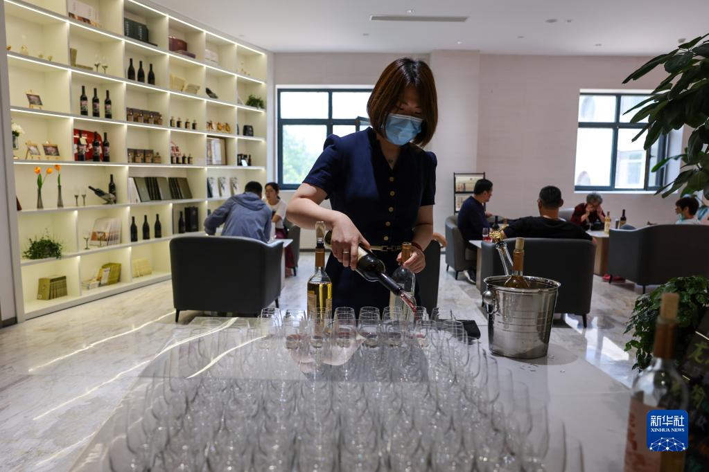 6月12日,张裕酒文化博物馆工作人员为游客准备品鉴用的葡萄酒。