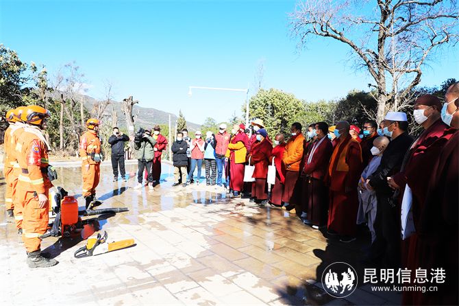 中队消防员在普济寺开展宣传演练。王杰/摄